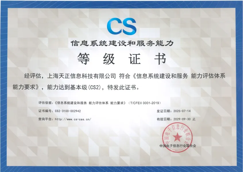 祝賀上海天正信息榮獲CS二級(jí)證書!